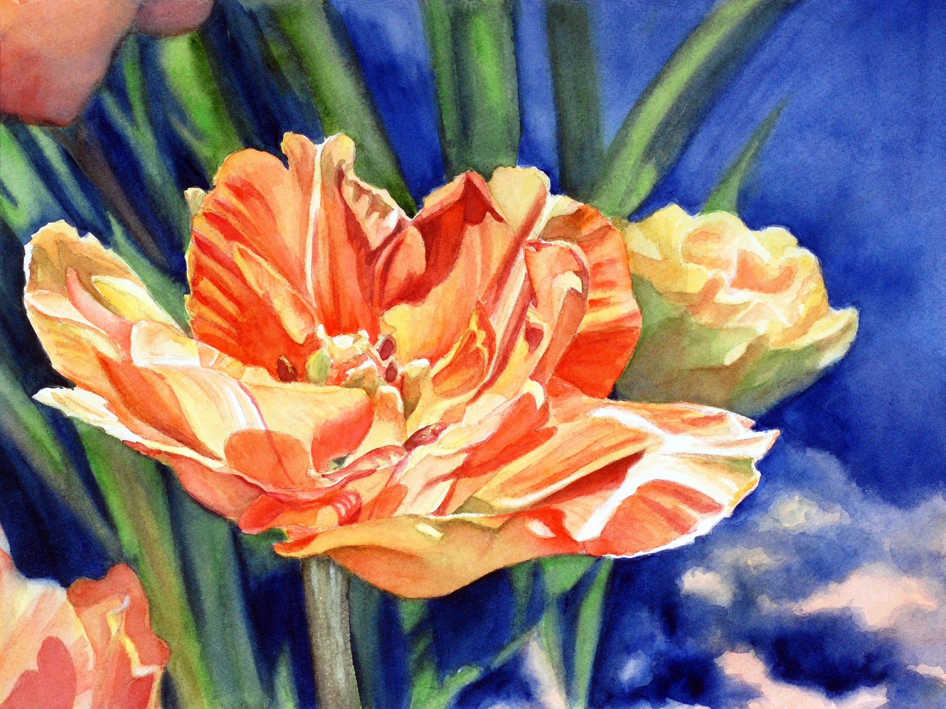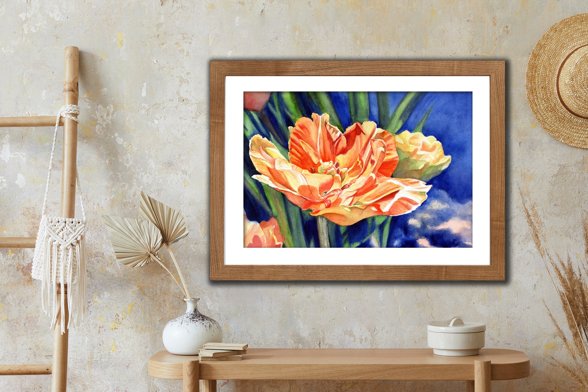 A stunning celebration of spring's vibrant energy, Sonic Bloom captures the bold beauty of tulips in full flower with remarkable color intensity and technical precision. This captivating watercolor showcases Laurie Humble's mastery of the medium through its dynamic interplay of warm orange and cool blue tones that seem to pulse with life and movement.