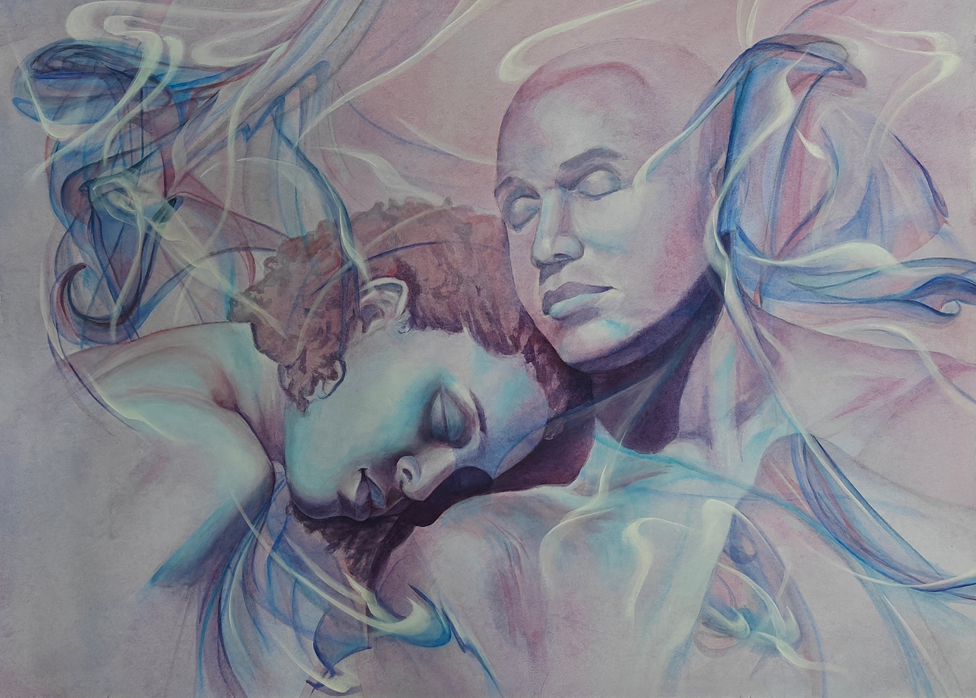 Executed in acrylic and liquid graphite on museum-grade archival paper, the composition features intertwined figures enveloped by ethereal, smoke-like forms that blur the boundaries between connection and ambiguity. The artist's sophisticated use of mixed media creates a nuanced interplay of textures and tones that shift with changing light and perspective.